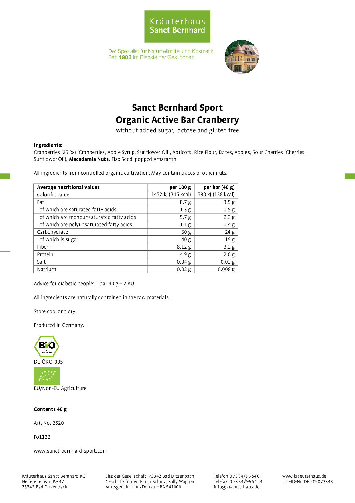 - 1x Organic Active Bar Cranberry 40 g, DE-ÖKO-005