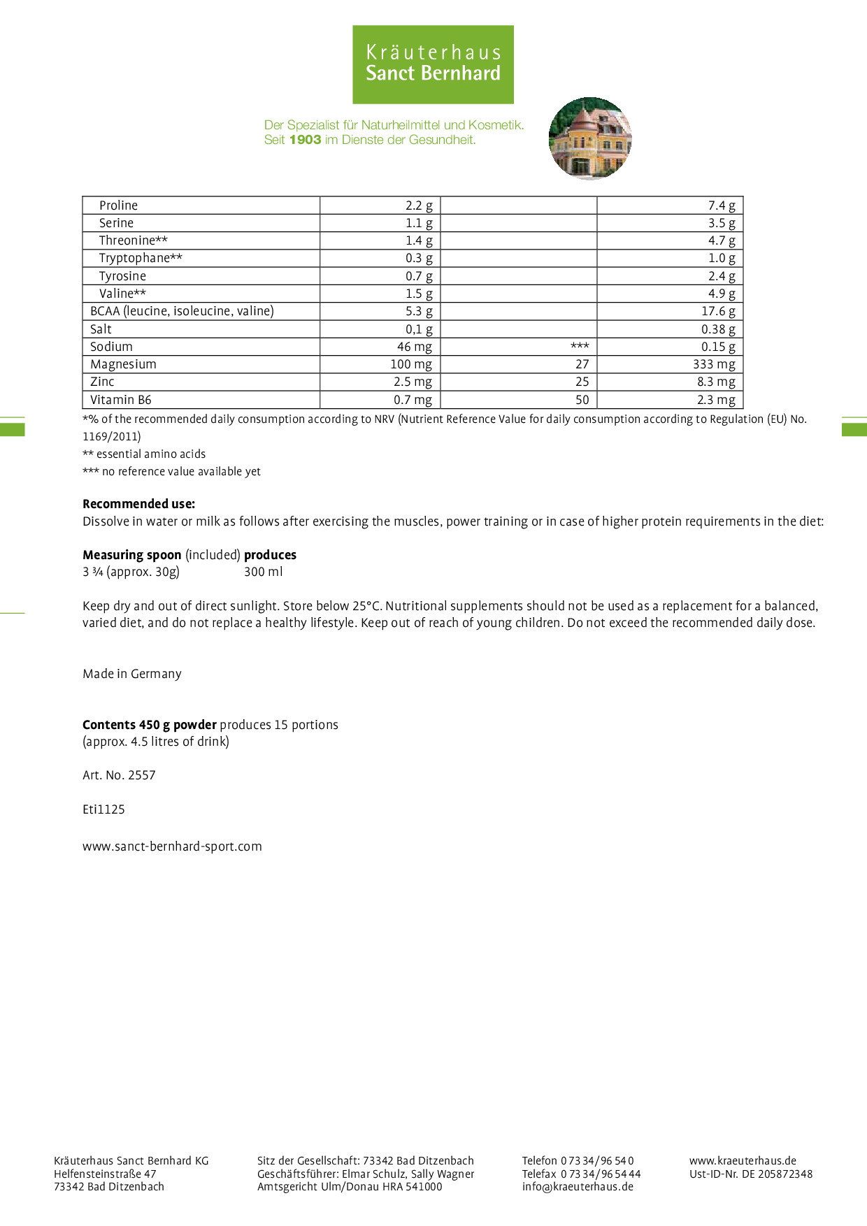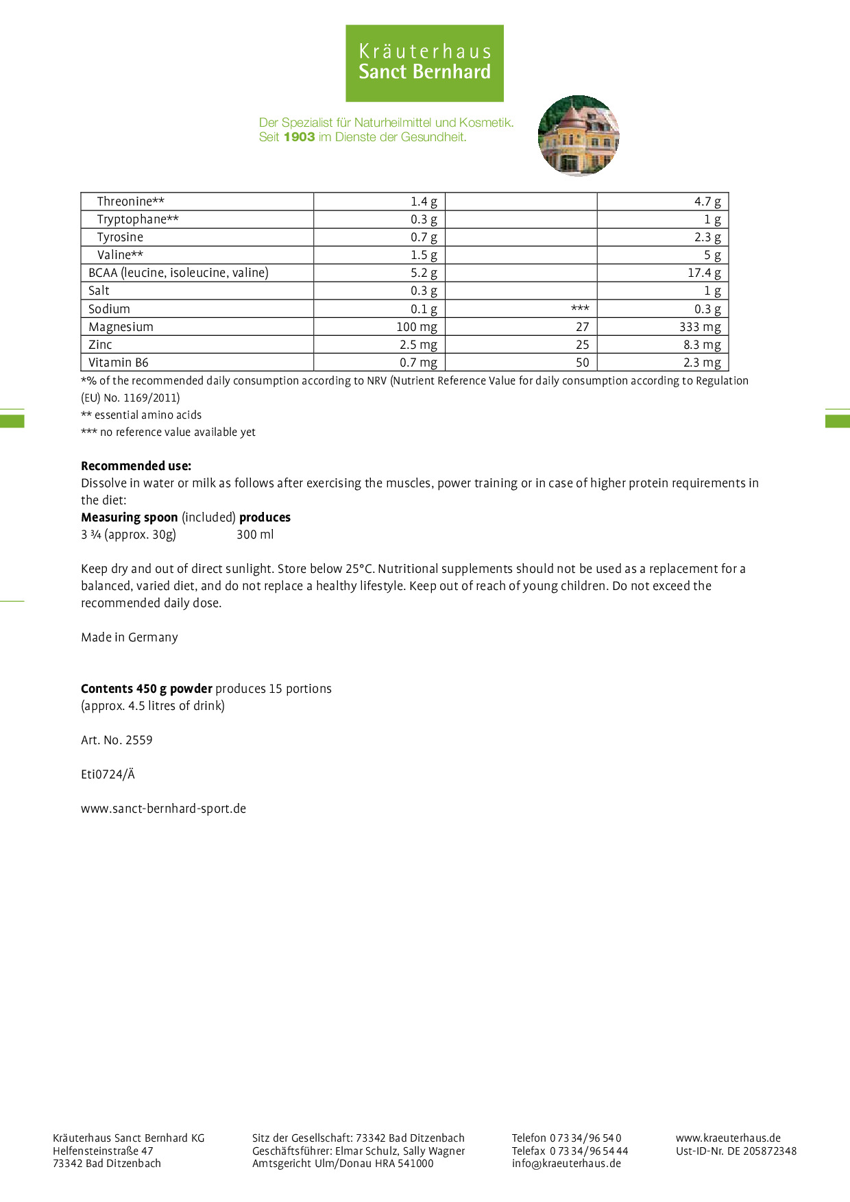Recommended use: Dissolve in water or milk as follows after exercising the muscles, power training or in case of higher protein requirements in the diet: