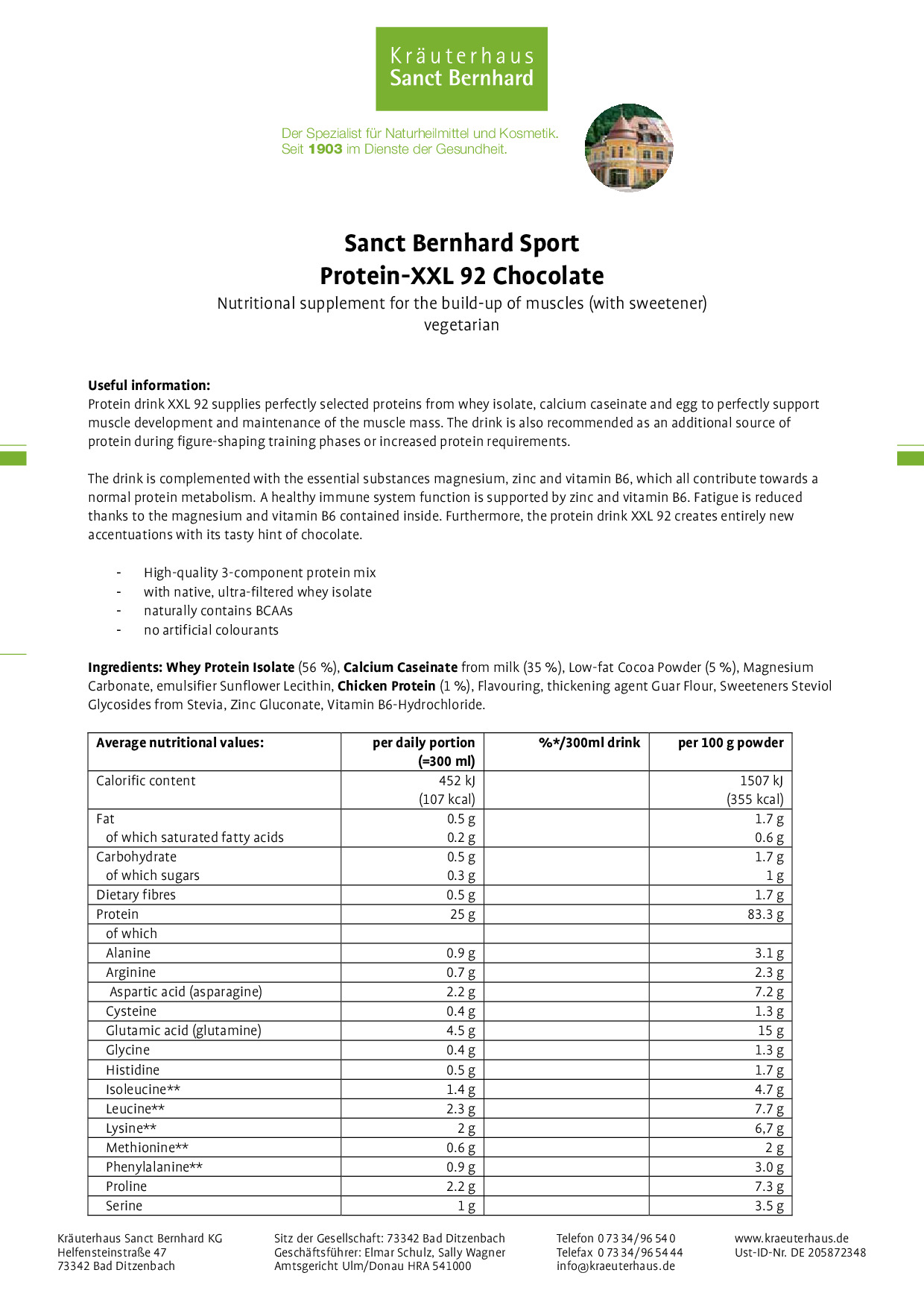 • Sanct Bernhard Sport Protein-XXL 92 Chocolate 450 g